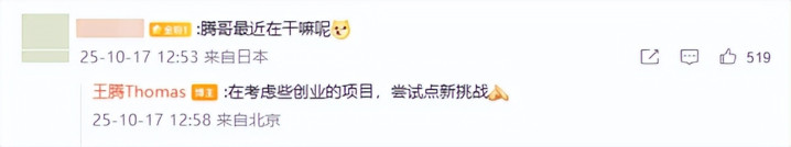 值得注意的是,王腾回复网友评论时首次回应下一步的计划:“在考虑些创业的项目,尝试点新挑战。”